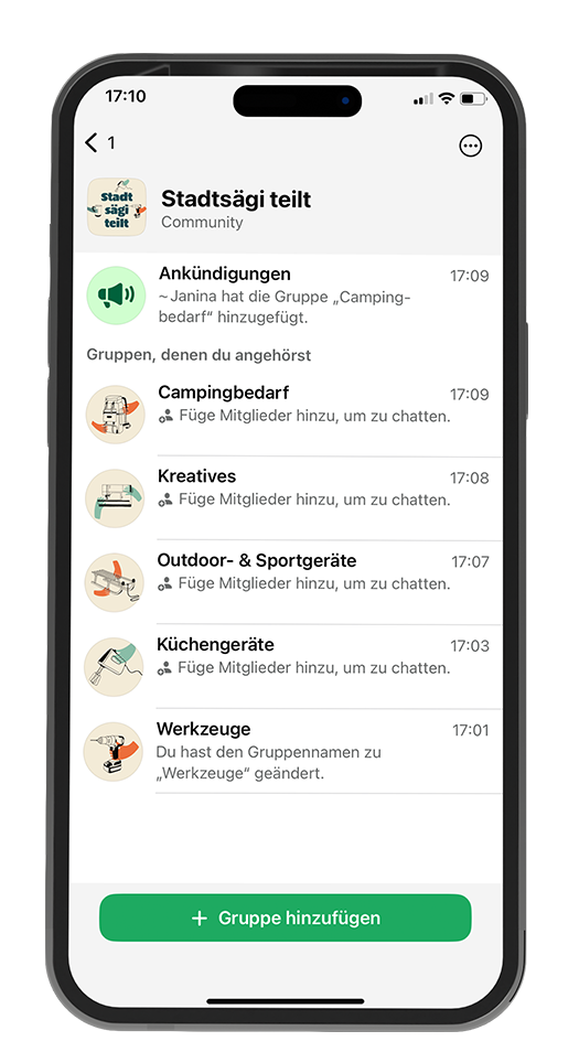 Alltagsgegenstände in der Siedlung unkompliziert teilen – das ist die Idee von «Stadtsägi teilt». Über eine Whatsapp-Community kannst du mit deinen Nachbar*innen in Kontakt treten und so Gegenstände aus- oder verleihen. Je mehr Nachbar*innen mitmachen, desto besser funktioniert es!